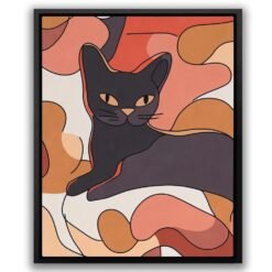 This sleek feline artwork blends bold lines and fluid organic shapes in a retro-inspired color scheme of burnt orange, terracotta, cream, and soft brown. With its minimal details and confident black silhouette, the cat becomes a calm focal point in the midst of swirling mid-century tones. Perfect for lovers of modern illustration, minimalist animal art, and earth-tone interiors.
